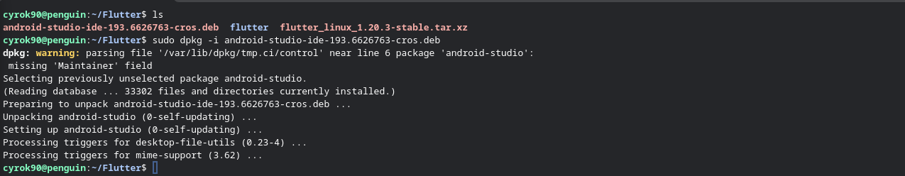 sudo dpkg -i android-studio-ide-193.6626763-cros.deb